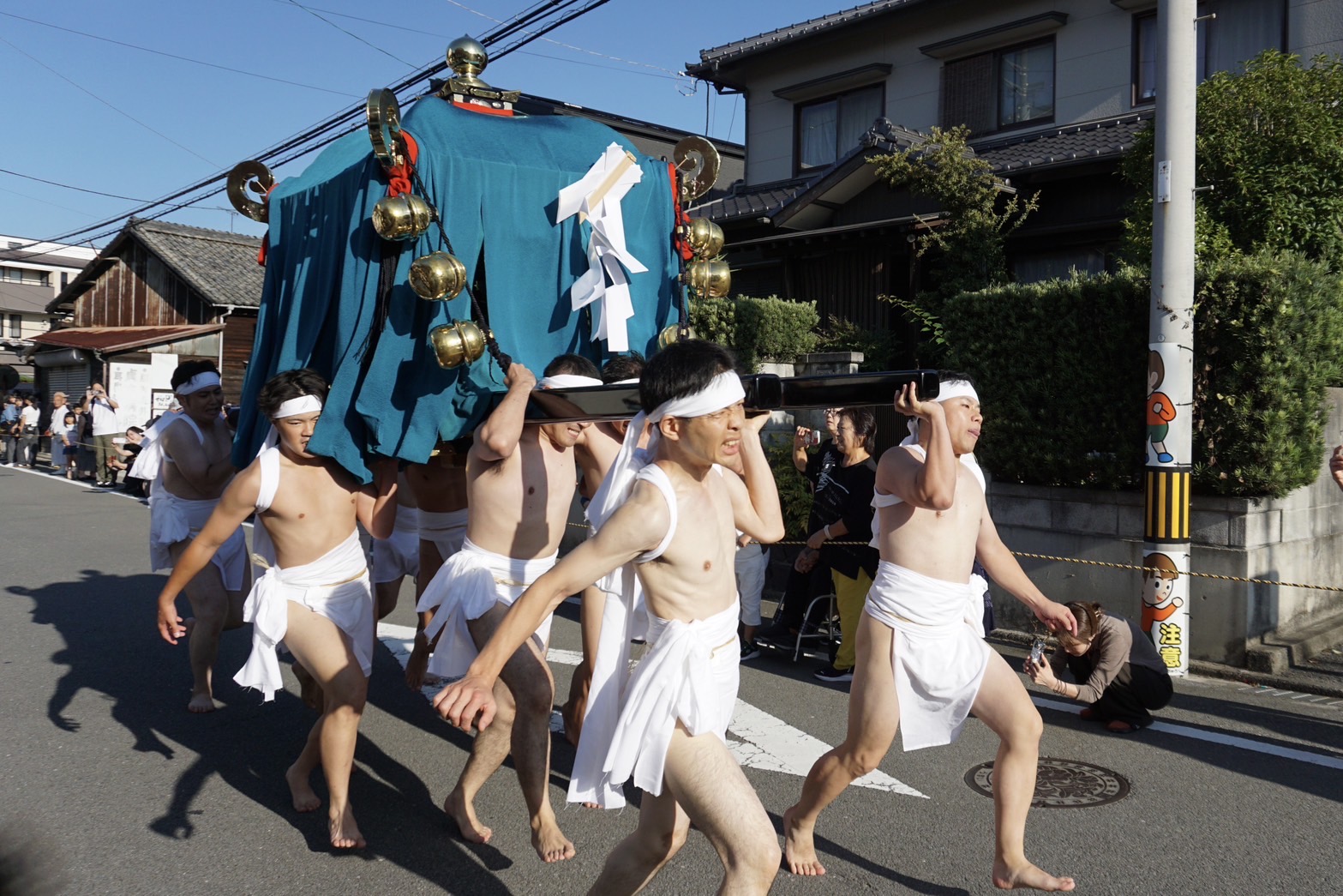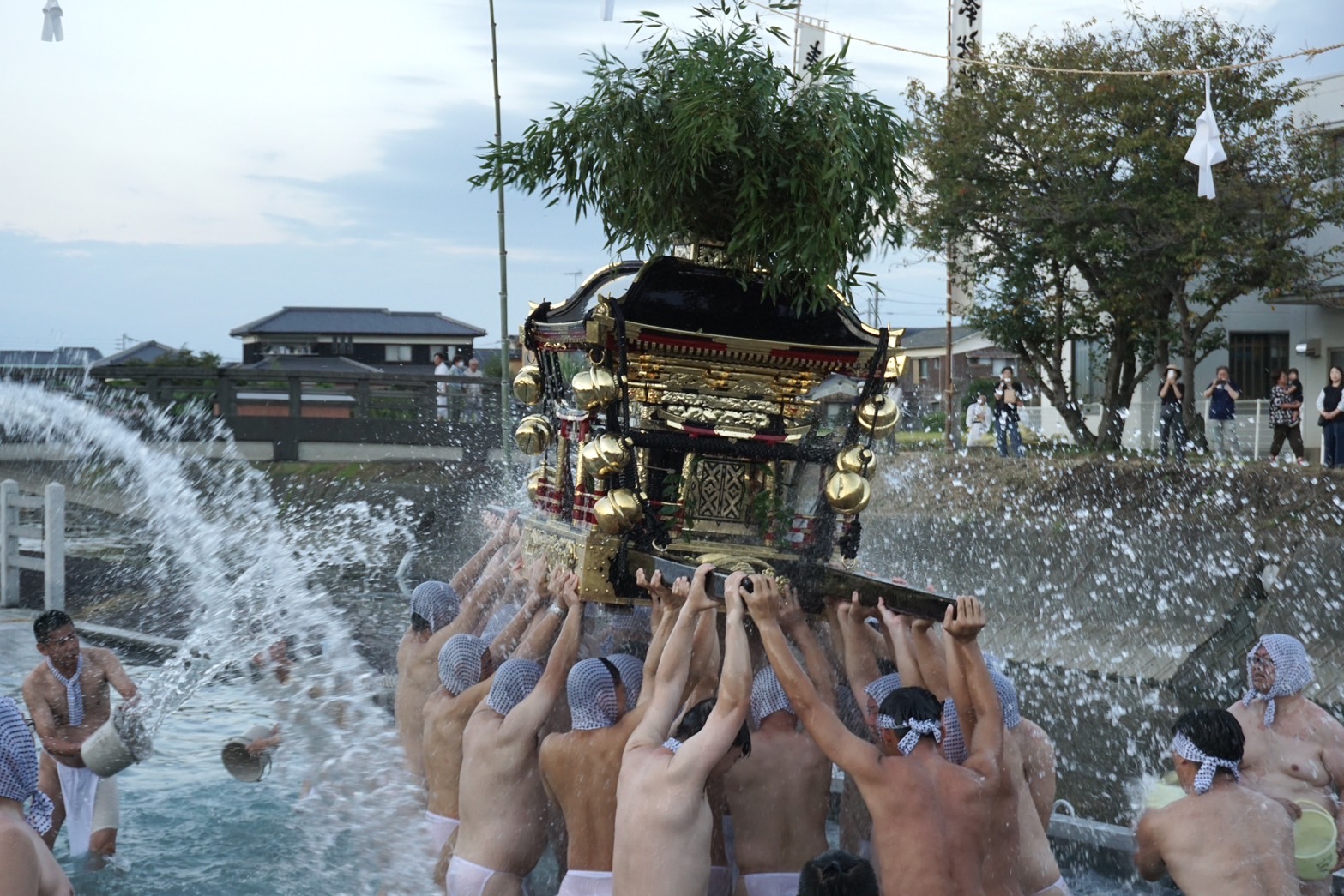 川狩りとは、安城寺町の青年頭取と神守が褌姿になり、神輿を久万川に担ぎ入れ、洗い清める神事です。安城寺町の神輿は、集落の渡御が終わると、川狩りを行ってから宮入りします。