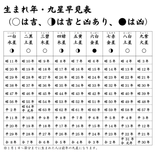 古来より日本に伝わる九星気学において、人は生まれた年によって九つの星に分類されます。これらの星は、立春を境に八角形の年盤の中の位置が変わるので、年ごとに運気や恵方・凶方位が変わります。そのため、当社では、立春の前日である節分に、「星廻りの悪い年は災難を除けるように、星廻りの善い年はより善い一年となるように」星祭の御祈祷を行っております。(星祭祈祷料 1人500円)