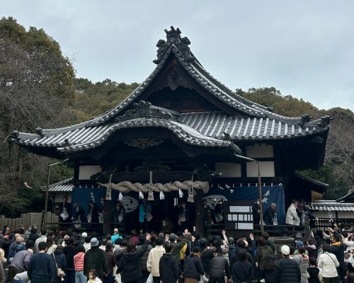 社殿からまく予定です。お餅の袋に当たりくじが入っていれば景品と交換します。